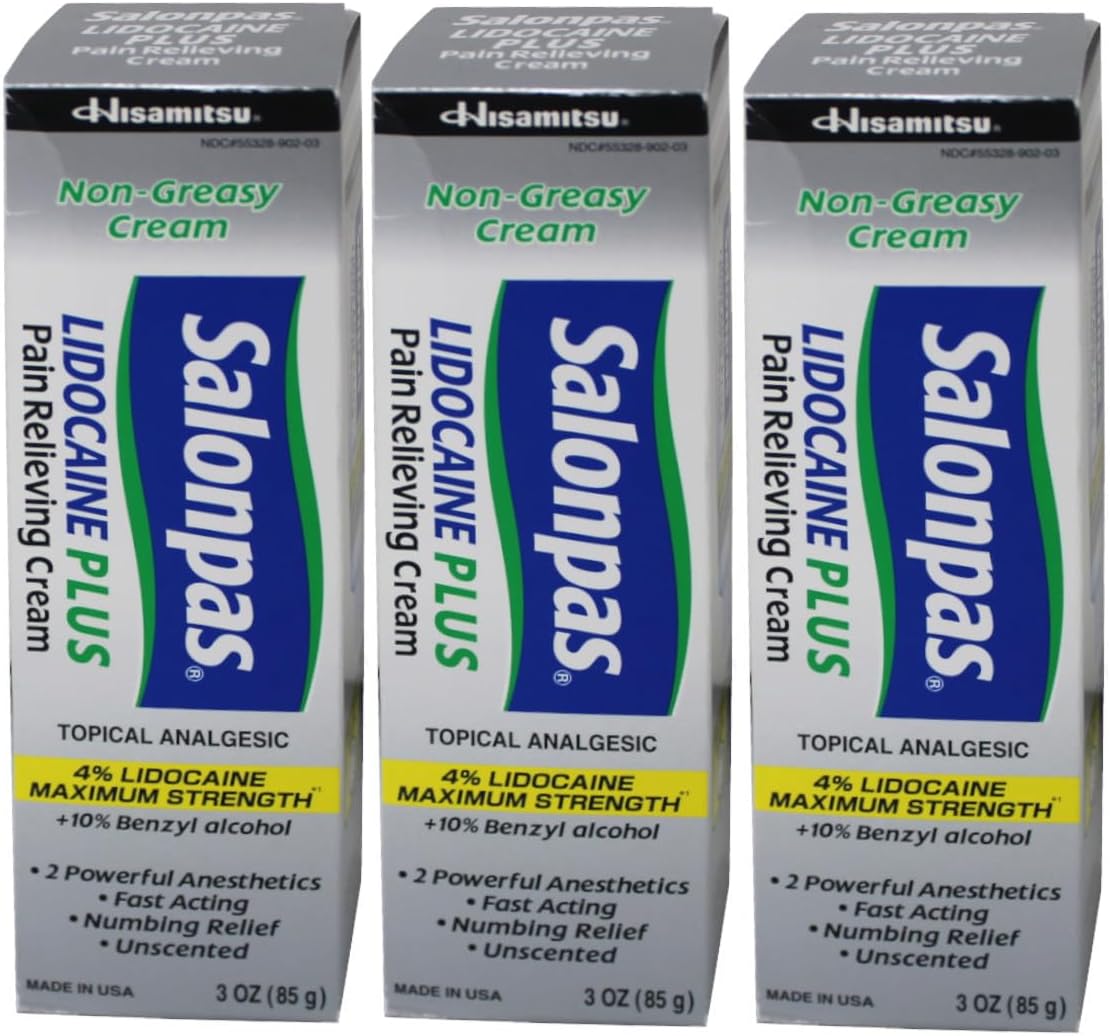 Salonpas’ Lidocaine Plus Cream (3 oz, 3-pack) with 4% lidocaine relieves back, neck, and joint pain. Fast-absorbing and non-greasy, it numbs discomfort quickly. Unscented and easy to apply, it’s perfect for daily use, offering convenient, targeted relief for muscle soreness or arthritis.